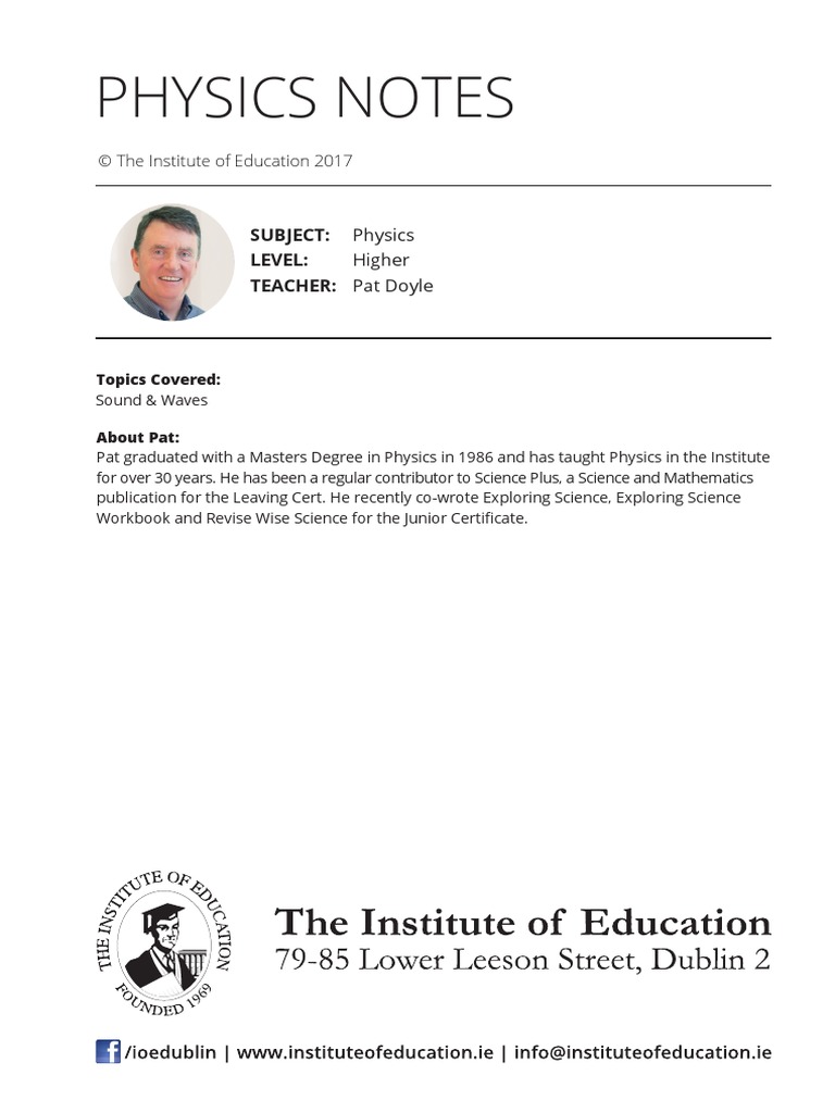 Physics Notes Subject Physics Level Higher Teacher Pat Doyle The Institute Of Education Topics Covered Sound Waves Pdf Free Download